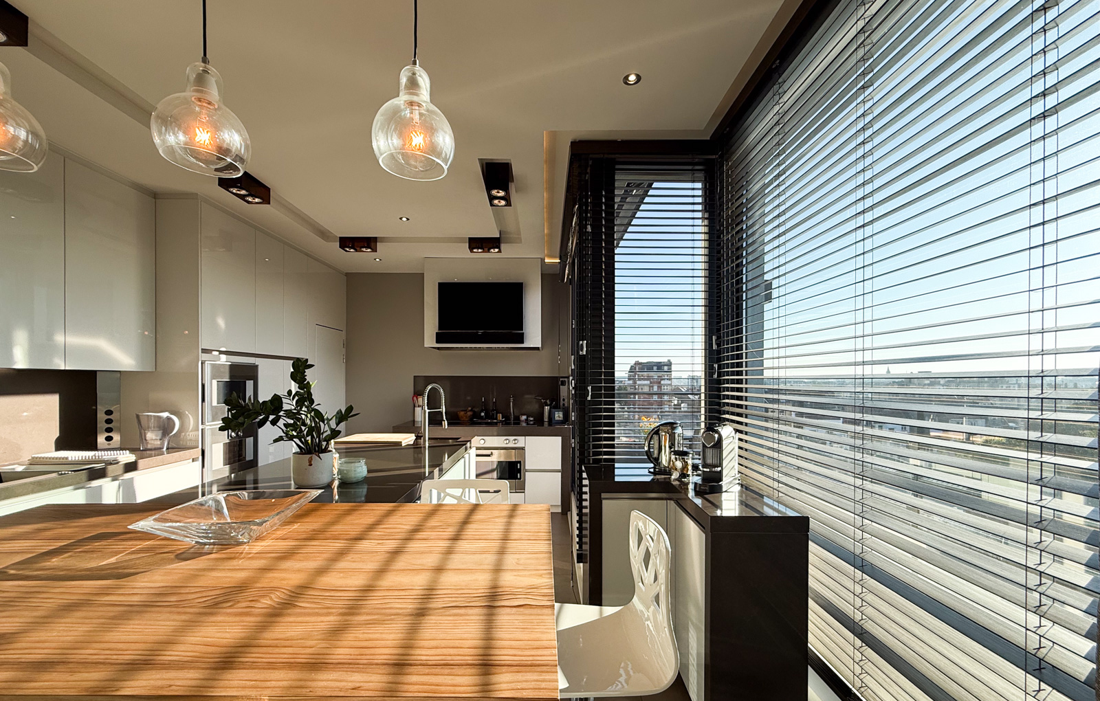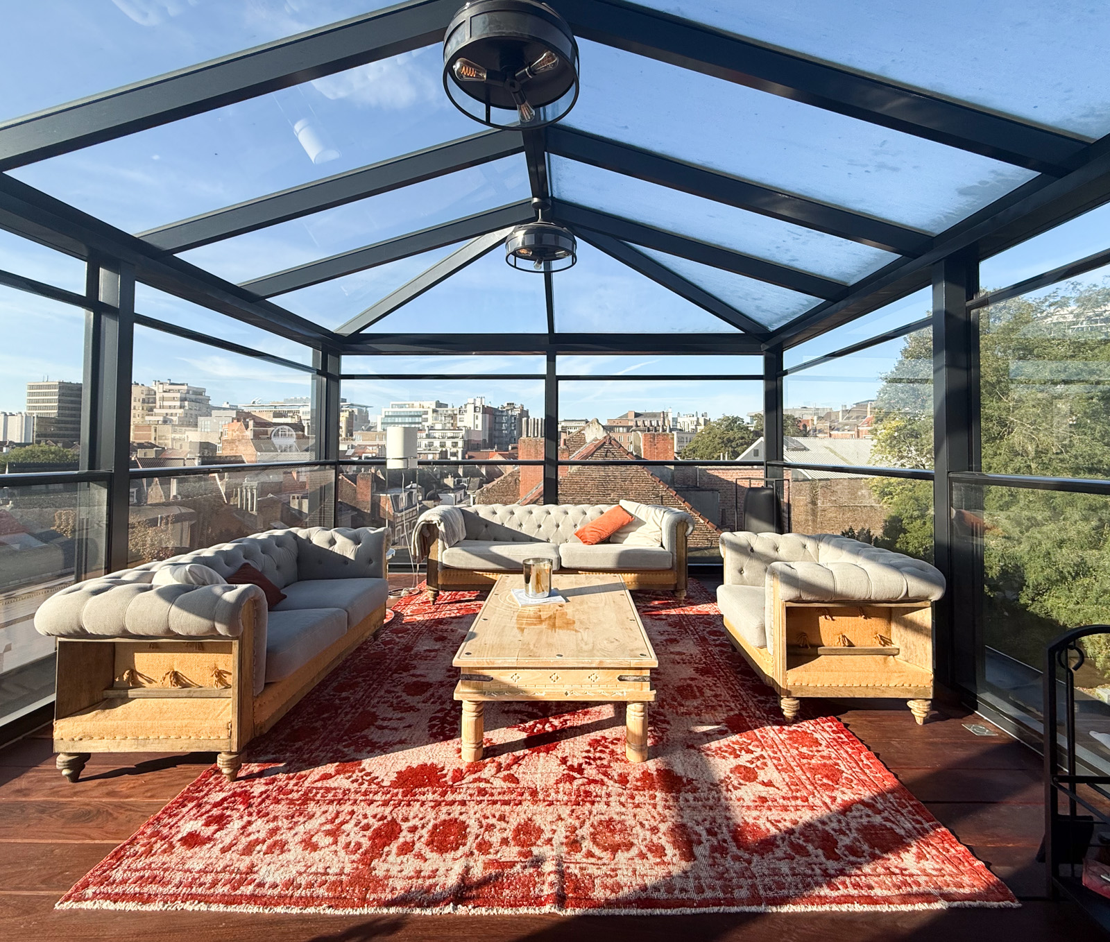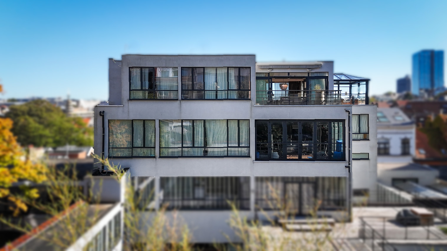 Au 5ᵉ étage, l’entrée s’ouvre sur un hall avec vestiaire et toilette invités, menant vers un lumineux espace de vie. La cuisine, entièrement équipée avec électroménager Gaggenau (± 40 m²), intègre une cave à vin et une chambre froide (± 5 m²) et donne accès à une première terrasse orientée sud-est. La salle à manger et le vaste salon avec bar (± 60 m²) s’ouvrent sur une deuxième terrasse (± 20 m²) équipée d’un système audio Bose et d’un chauffage extérieur. Un jardin d’hiver vitré (± 40 m²) avec poêle à pellets, prolonge le séjour et offre un espace de détente avec une vue panoramique. Ce niveau comprend également un salon TV indépendant (± 20 m²), une buanderie/local technique ainsi qu’une première chambre (± 20 m²) avec salle de douche et WC séparé.