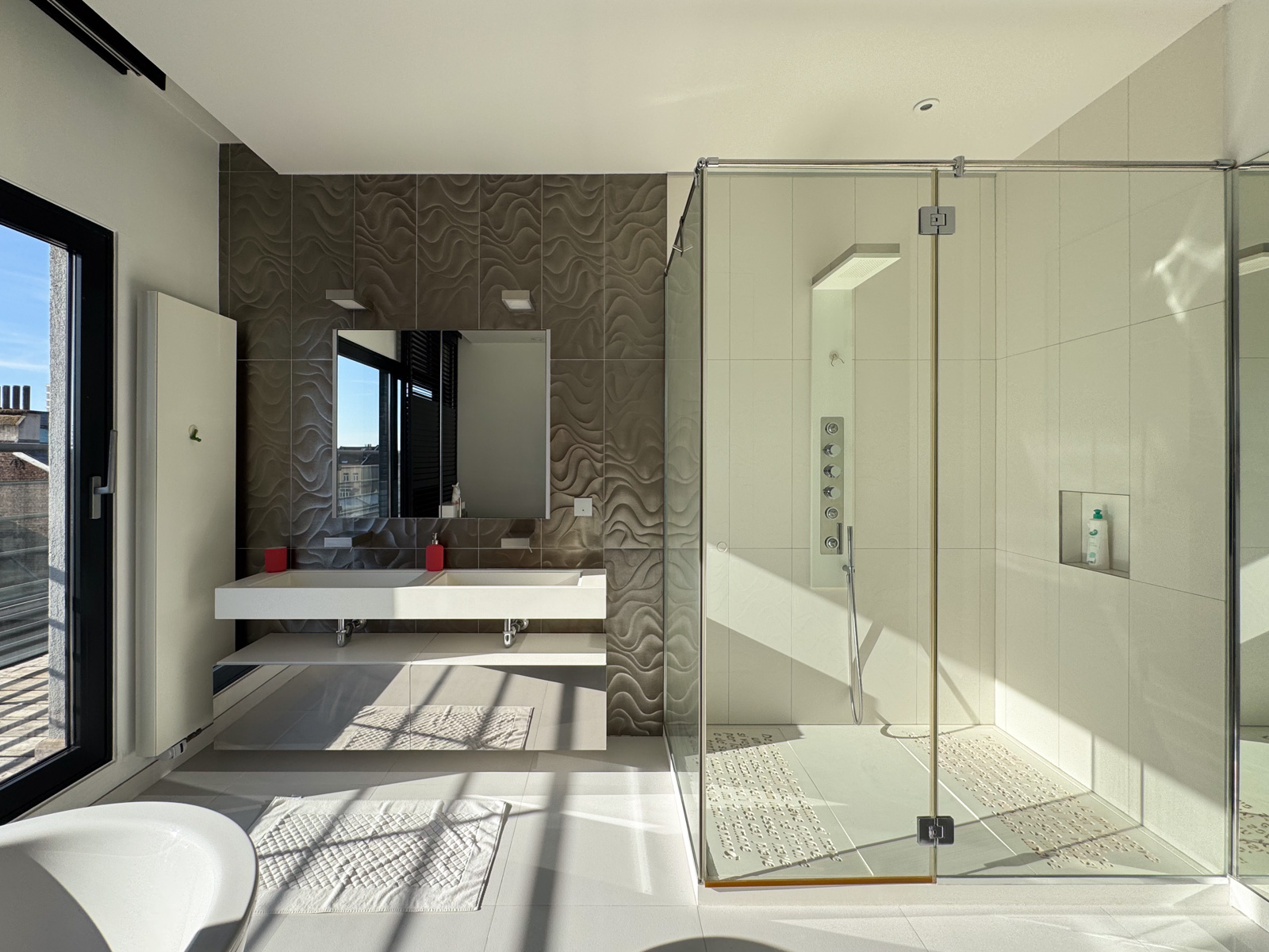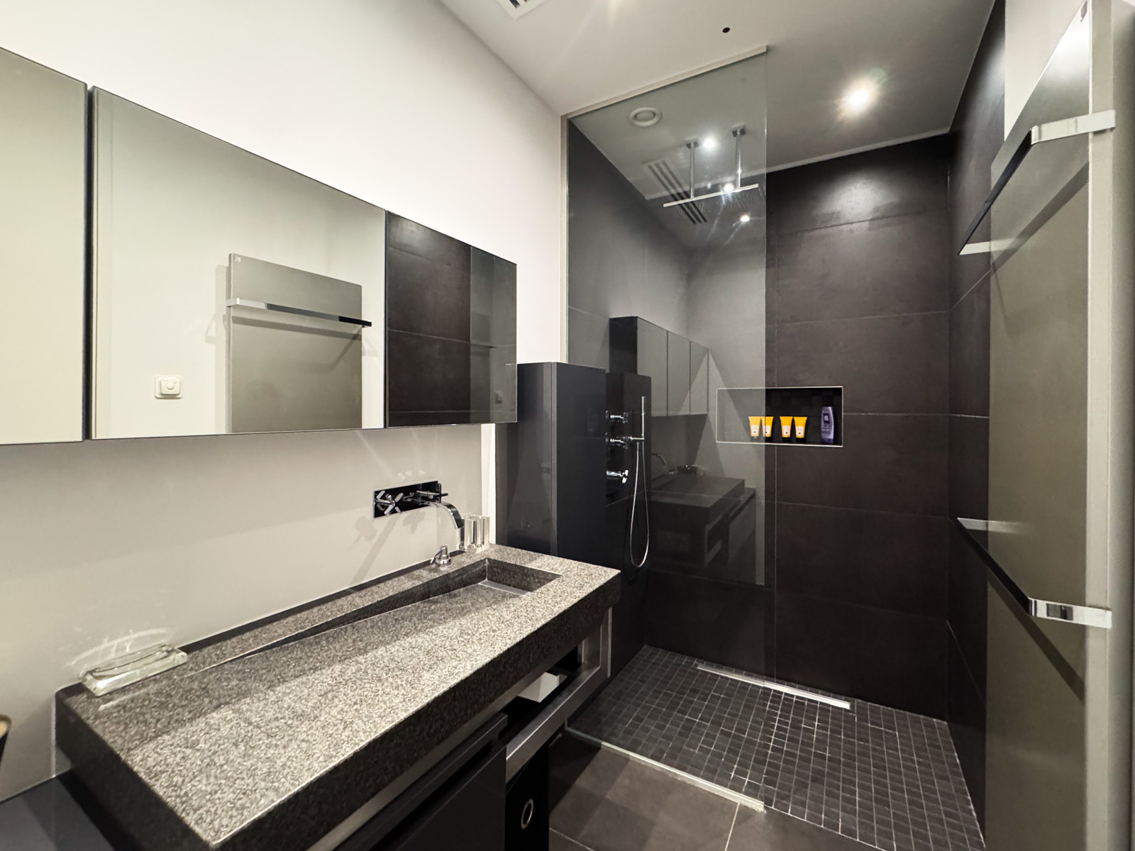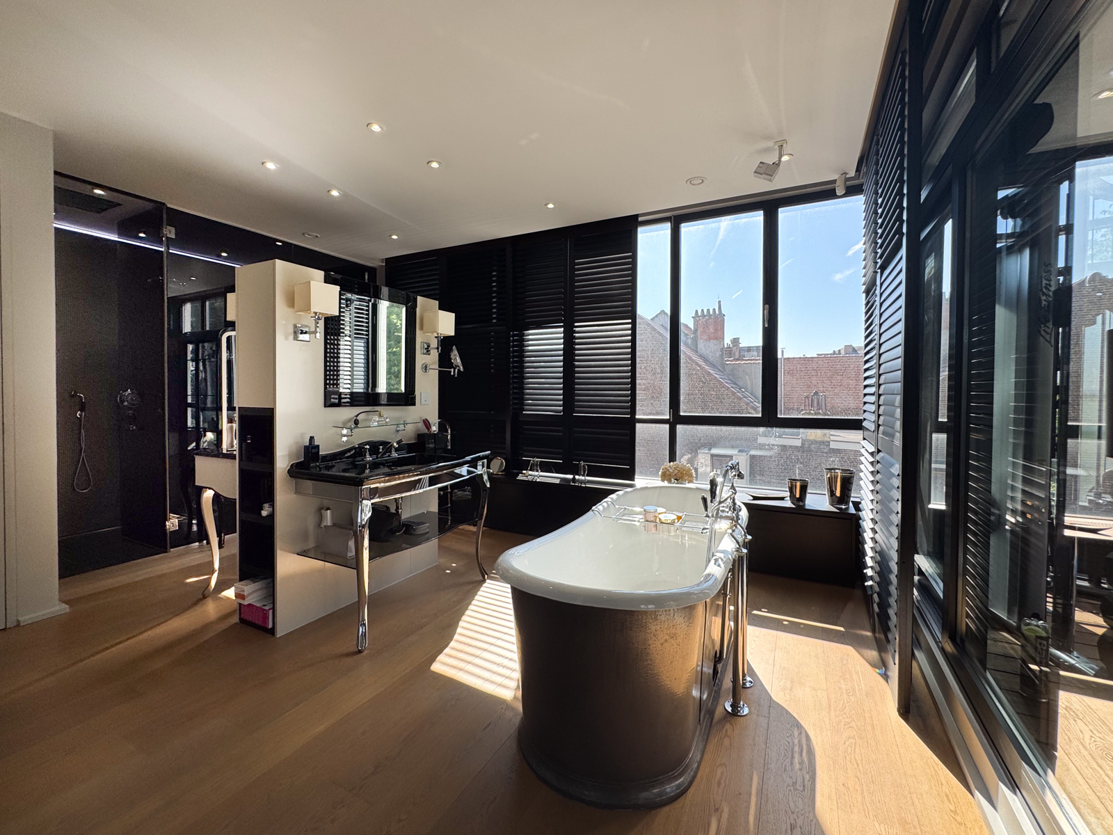Au 4ᵉ étage, la zone nuit se compose de deux somptueuses master bedroom et de deux chambres supplémentaires. La première master bedroom (± 36 m²) comprend une chambre avec dressing et une salle de bains/douche avec WC séparé (± 14 m²), avec accès à une terrasse orientée sud-est. La seconde master bedroom (± 50 m²) propose une chambre, un bureau, un dressing ainsi qu’une une salle de bains/douche avec hammam et un WC séparé (± 23 m²) et une salle de sport avec vue panoramique (± 20 m²). Deux chambres supplémentaires (± 20 m² chacune) disposent chacune d’une salle de douche et de WC, avec accès direct à la terrasse.