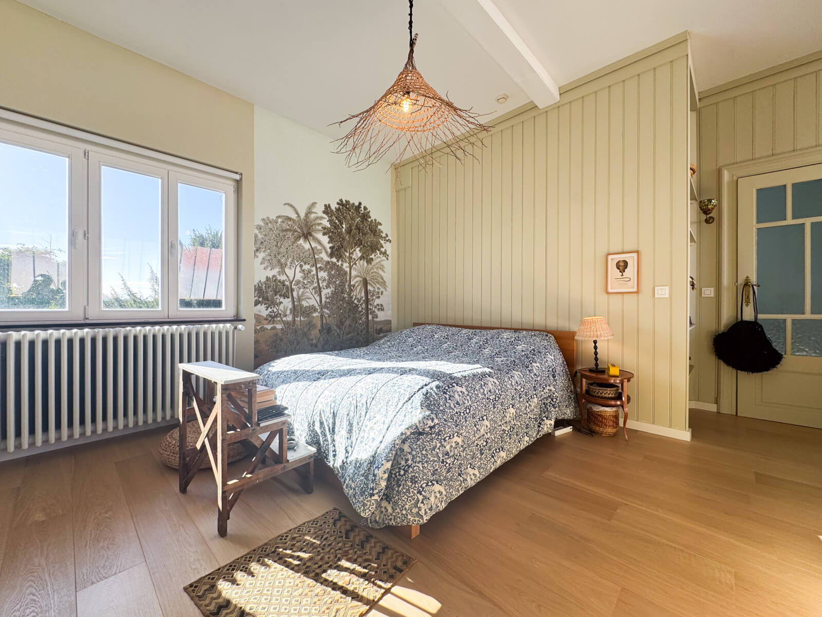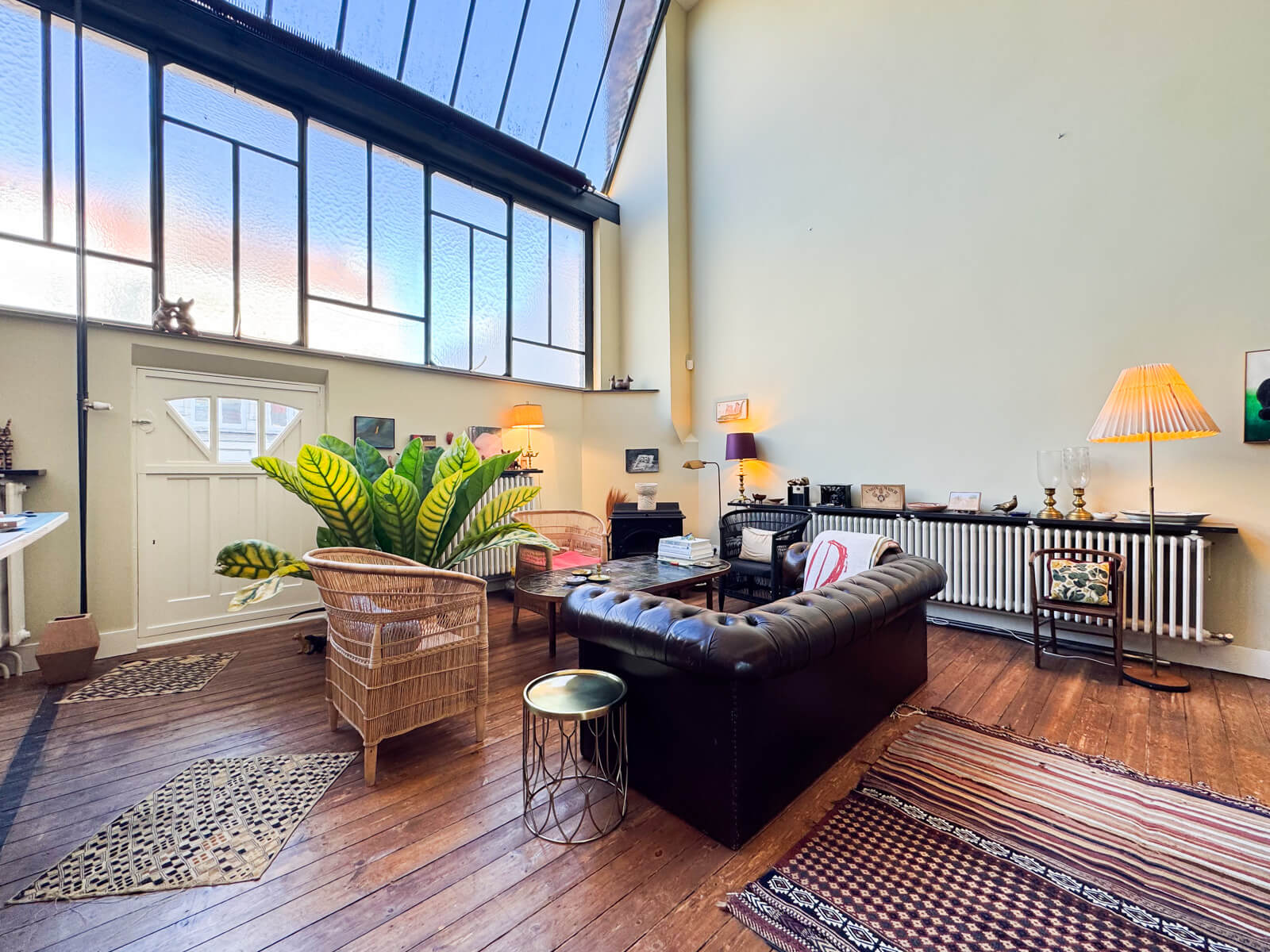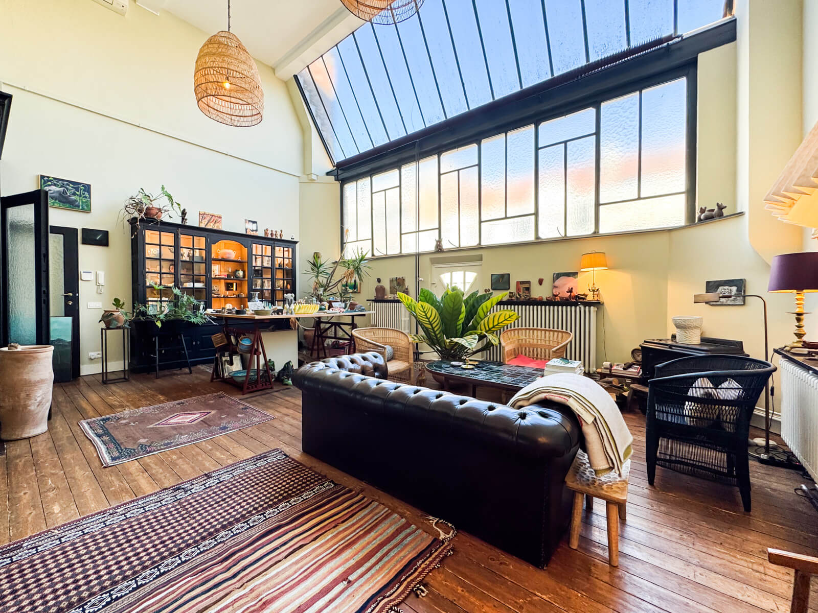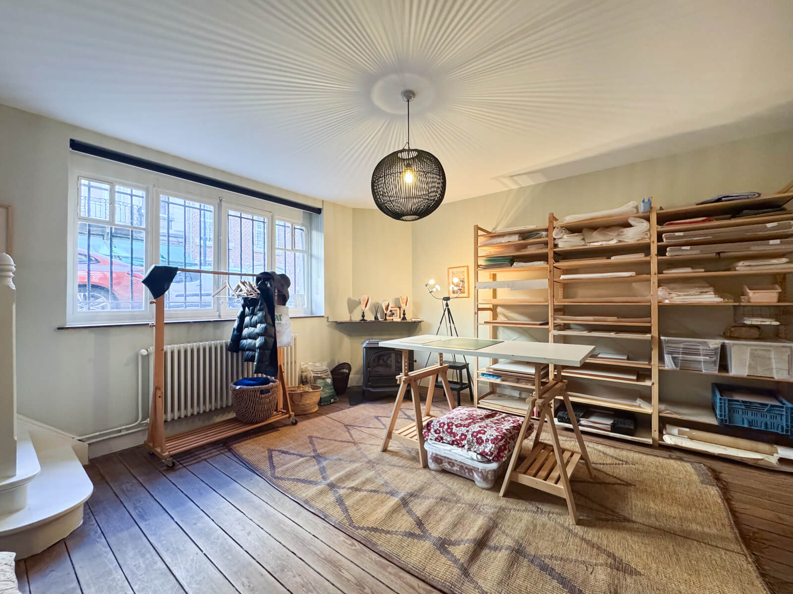 First floor: the former artist’s studio (± 80 sqm), with 6-meter-high ceilings and a large skylight, offers exceptional brightness. This space now hosts a vast living area with an open fireplace, including a lounge, dining room, and a second kitchen opening onto a terrace. A mezzanine overlooks the space and includes a bedroom (± 20 sqm) and a bathroom with dressing room and toilet (± 14 sqm).