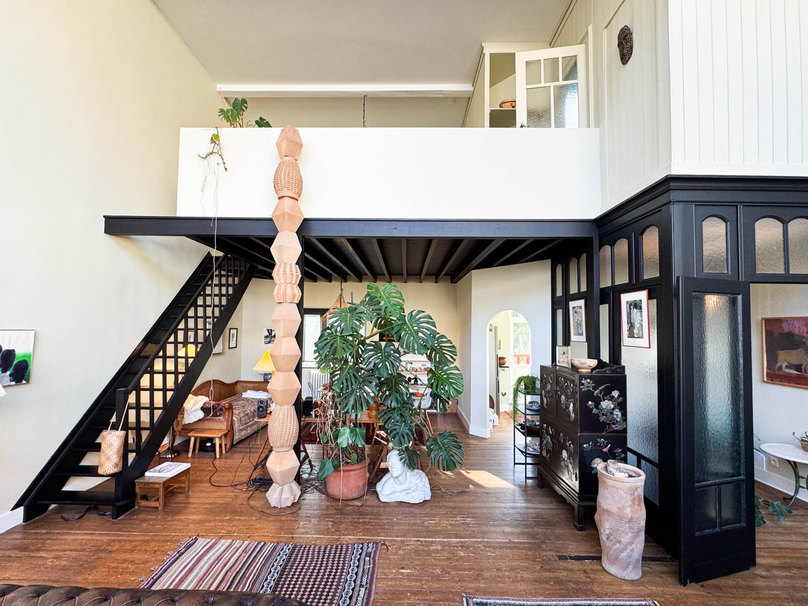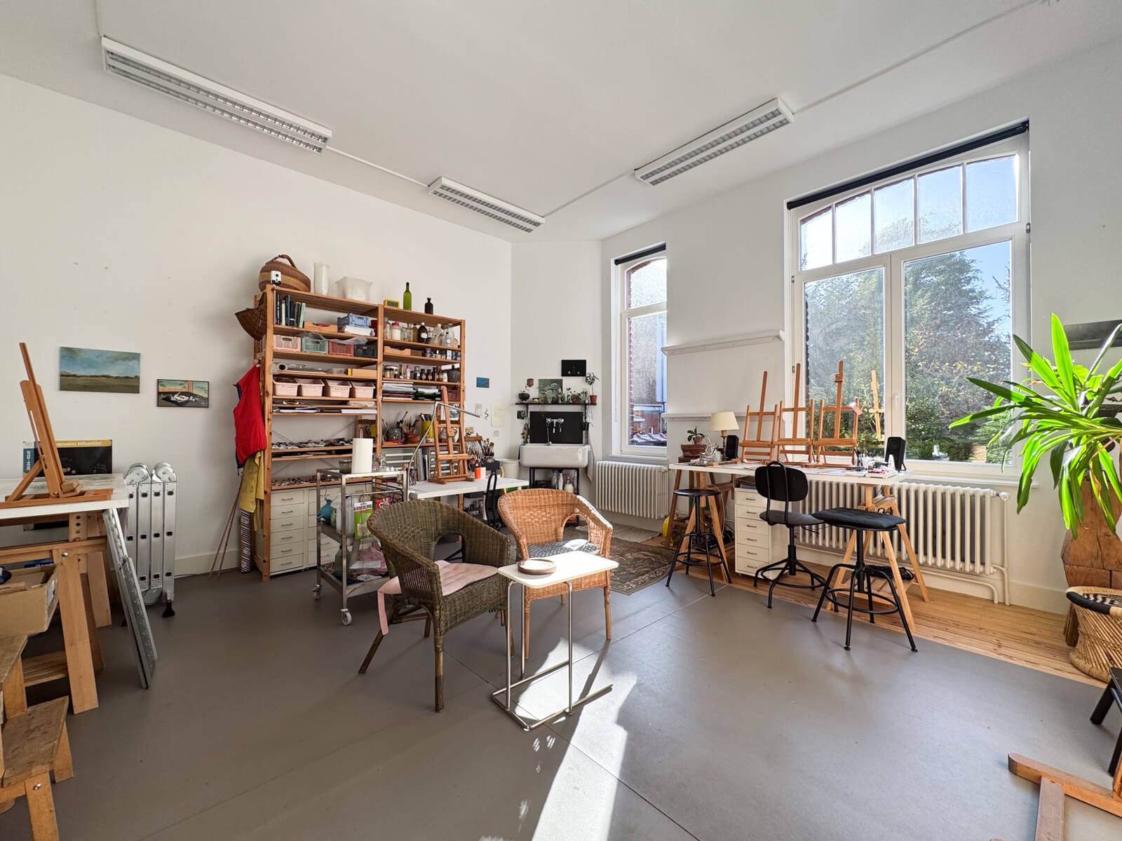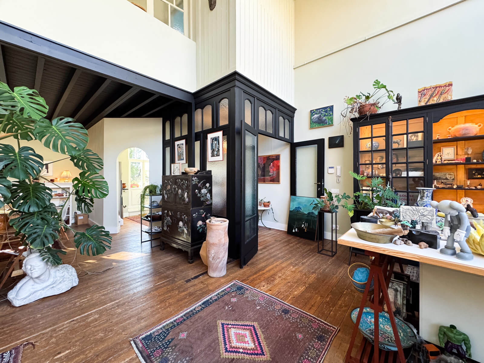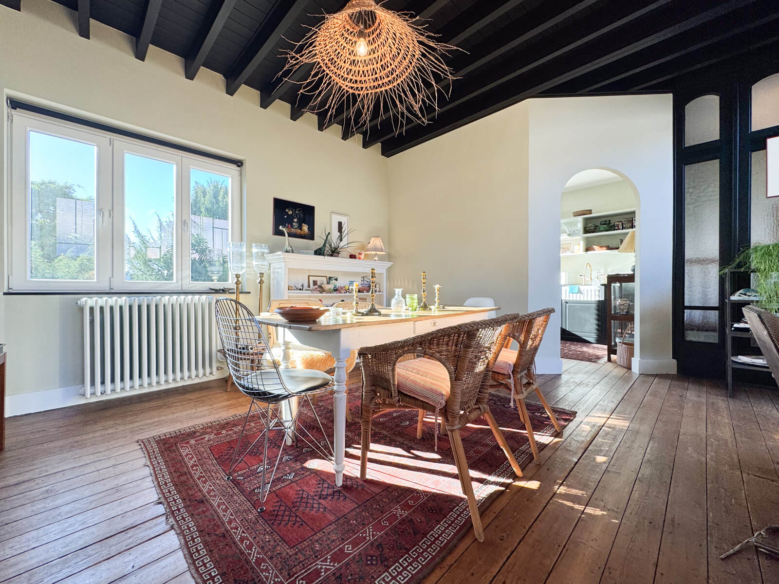 First floor: the former artist’s studio (± 80 sqm), with 6-meter-high ceilings and a large skylight, offers exceptional brightness. This space now hosts a vast living area with an open fireplace, including a lounge, dining room, and a second kitchen opening onto a terrace. A mezzanine overlooks the space and includes a bedroom (± 20 sqm) and a bathroom with dressing room and toilet (± 14 sqm).