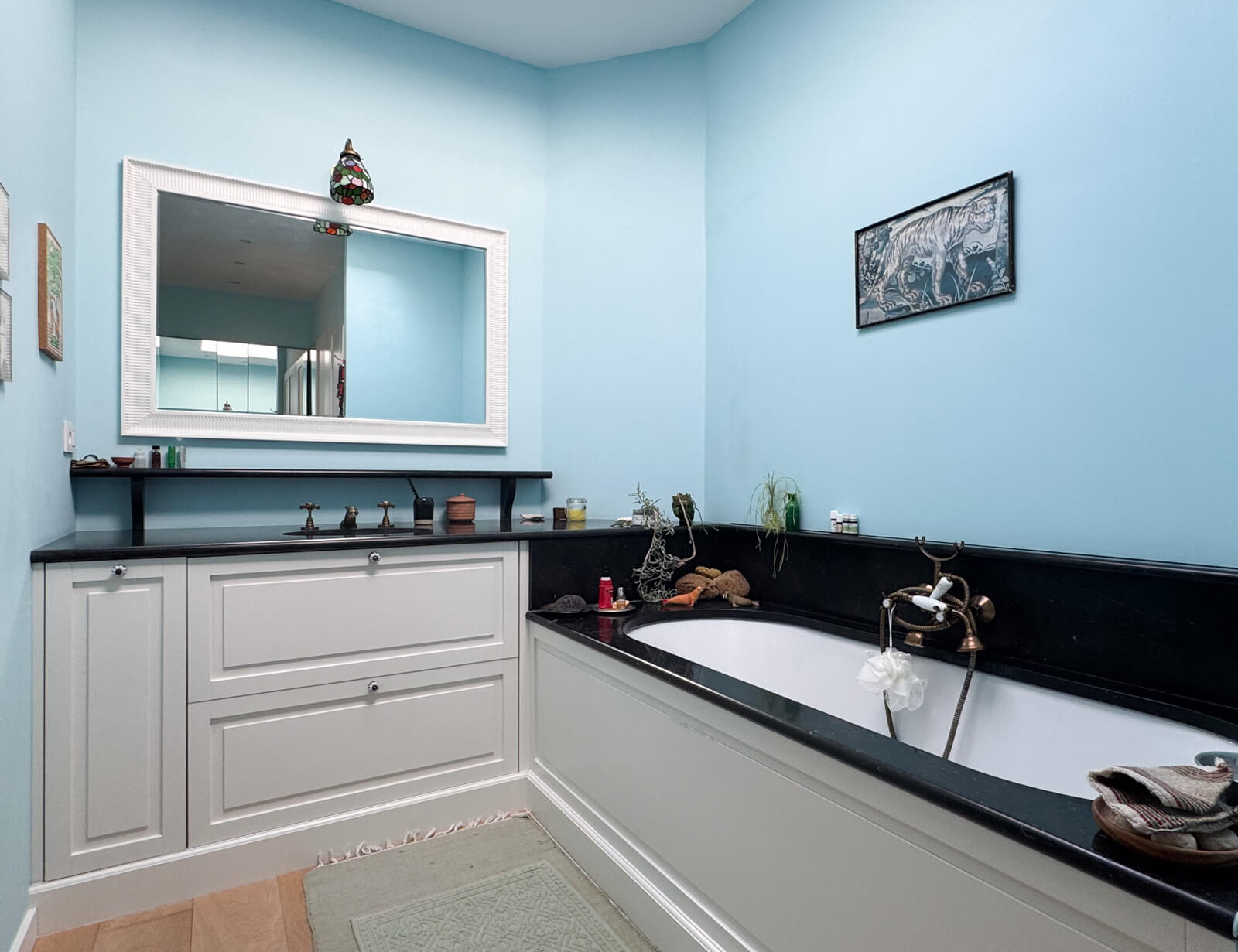 Ground floor: an elegant entrance hall leads to two additional rooms, currently used as studios (± 27 sqm and ± 25 sqm), but easily adaptable into extra bedrooms, as well a first kitchen with a terrace providing direct access to the garden.